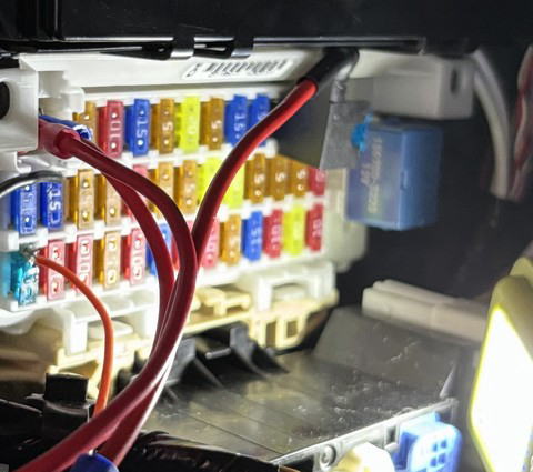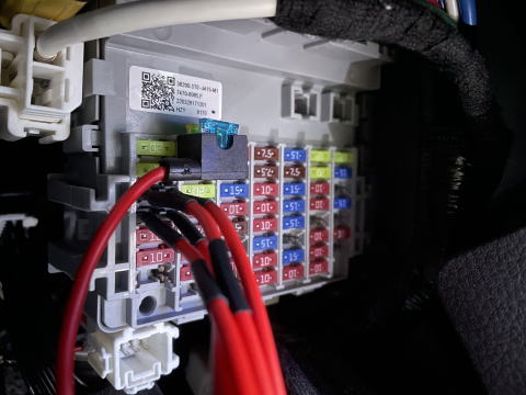 埼玉のM・T 様 2025/8月 スズキ ハスラーMR52S 電源取り出ヒューズタップはD/Lに挿す場合リード線の曲げ加工が必要です。曲げなければ画像の様に上部が浮くのでドアロックが効かなくなりやすい。 |